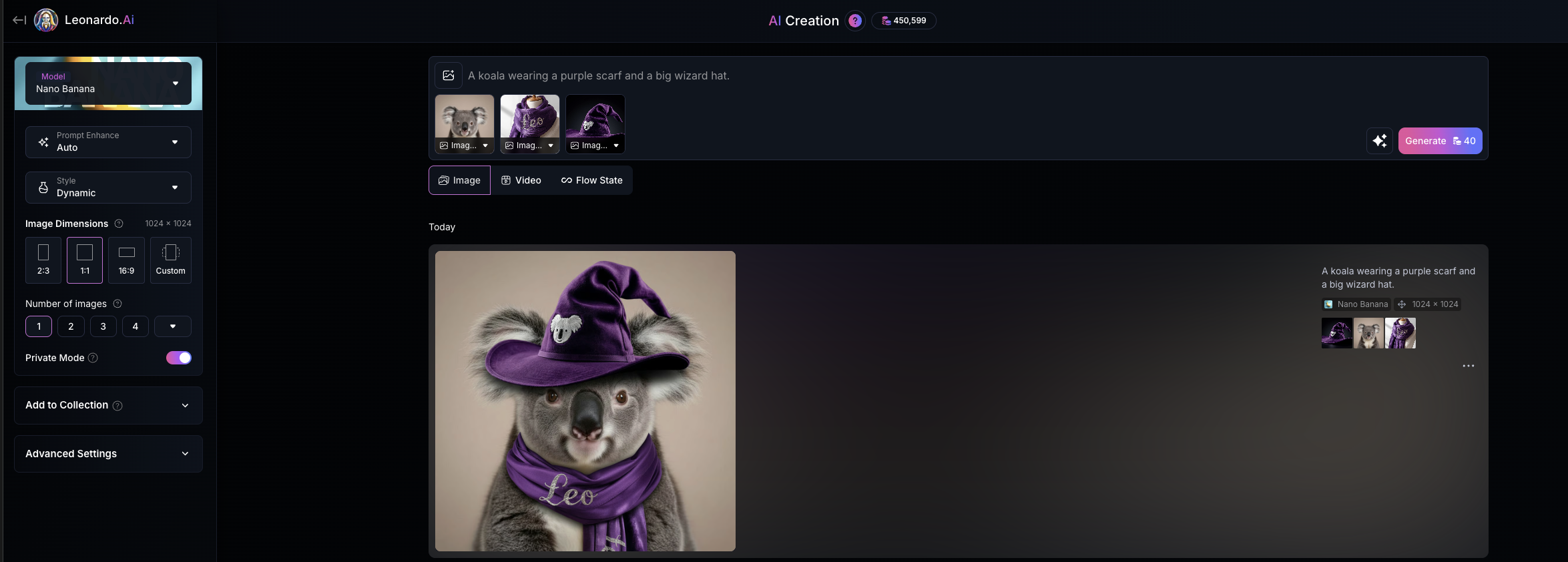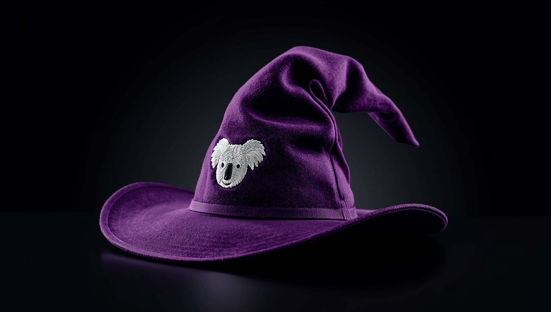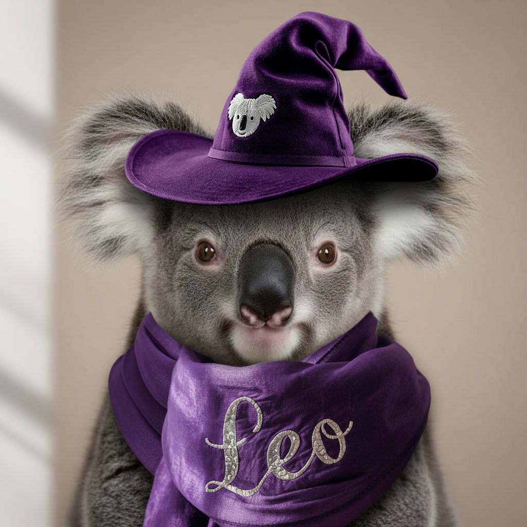 "prompt": "A koala wearing a purple scarf and a big wizard hat.",