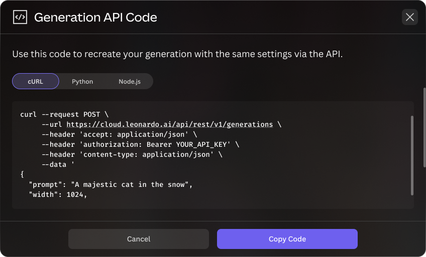 The Get API Code feature bridges the gap between experimenting in the Leonardo web app and implementing via the Production API. Once you've achieved the results you want in the web app, you can instantly export the exact configuration as ready-to-use code snippets.